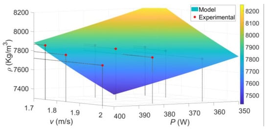 A surface plot of bulk density with respect to laser power and scanning velocity is shown in Figure 7, where it is evident that bulk density increases with lower scanning speed and tends to decrease with increasing laser power. Higher scanning speed implies less exposure time of the laser to the powder bed which is related to energy input and sample densification. High laser power values may be related to powder particle sublimation and ejection affecting densification [52]. It is important to point out that the specific values of C and α are only valid in the range interval values of π1 from 3.17 × 10−8 to 4.6 × 10−8, determined according to the manufacturing parameter values used during the fabrication of the metallic samples.