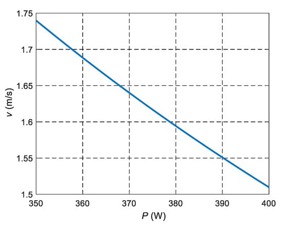 In this case, Equation (16) can be used to predict the laser power supply as a function of the scanning speed needed to achieve high densification on the AM metallic sample, as shown in Figure 7 for Inconel 718. Specific recommendations for the definition of laser scanning velocity, with respect to laser power, to SLM In718 pieces may be drawn from Figure 8. For example, with the specific conditions described in the experimental set up of this work, if a laser power of P = 390 W is defined, a laser scanning velocity of v = 1.55 m/s is needed to achieve highly dense components. Likewise, if a laser scanning velocity of v = 1.7 m/s is defined, an approximate laser power value of P ≈ 357 W will do so too.