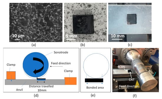 Figure 4a). The sonotrode was dropped onto the sample at the edge and rolled for 10 mm before moving the sonotrode away to remove the force applied. However, due to the large force applied (600 N) and due to dragging of the sonotrode before lifting, the PcBN sample cracked on one side due to its brittle properties. Also, the carbon nanotube coating did not bond strongly near the edges, which may be likely due to the pressure applied by the sonotrode and which was suddenly removed. Yang et al. [