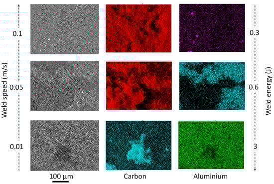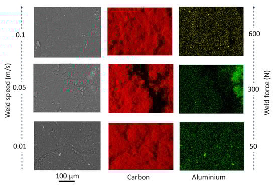 −1) was significant in affecting the instantaneous pressure between the two contacting surfaces. It was expected that slower speeds and longer deposition time would facilitate diffusion, but those results might evidence that a full range of parameters should be considered for diffusion to be the dominant bonding mechanism. From the analysis of the elemental composition achieved via EDX, two main elements were found on all achieved coatings: carbon and aluminium. The first one expected as a dominant element of the CNTs and the latter being infiltration from the PcBN substrate. Elemental composition analyses in