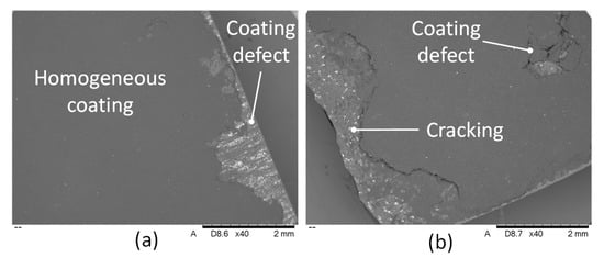 −1 in Test C) increased the average thickness up to 95.13 μm, diminishing the homogeneity of the coating, which appeared porous in extended areas of the sample (