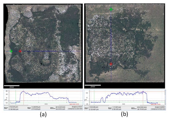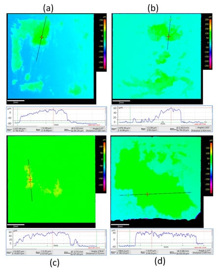 Figure 6a). The focus variation measurements for Test D (1.2 J) showed an average thickness of 39.82 μm, with the smallest thickness measured at the edges (average of 8.06 μm), and patches of bonding of different coating thicknesses are apparent in the colour scale bar in