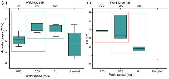Figure 7b). A good compromise between micro-hardness and good surface integrity (Sa) was achieved for Test A (speed, 0.1 m·s