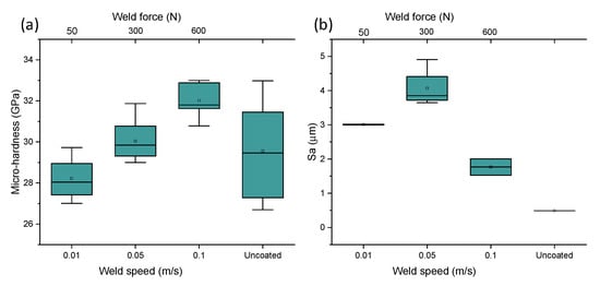 Figure 7a), although in both cases, the average micro-hardness values are 8–10% above the uncoated materials. This result is in accordance with investigations by Kong et al. [