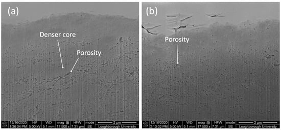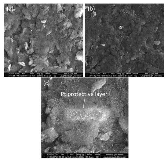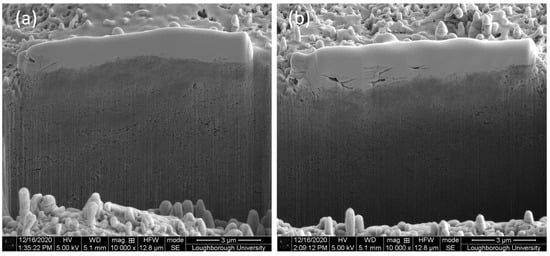 Figure 11b). After SEM analyses of these two coating conditions, the samples were prepared for focus ion beam milling. The application of a platinum layer (length 10 μm, width 3 μm, and thickness 1 μm) was carried out in the site of milling in order to protect the entire exposed surface prior to FIB milling, as shown in
