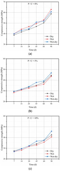 The P/C ratios varied from 0 to 20%. The relationship between the epoxy latexes content and the compressive strength of mortar specimens with different curing regimes at the ages of 7 d, 14 d, 28 d, 45 d, 60 d, and 90 d is shown in Figure 3. In general, the compressive strength of epoxy modified mortars tended to decrease with the increase of the P/C ratios. In the case of dry curing, the compressive strengths of mortars with different P/C ratios had a reduction of 30–45% compared with control mortars without epoxy latexes at the age of 90 d. A similar tendency could be observed in the wet curing and wet–dry curing regimes. The result is consistent with the literature [55,56] inclusion of polymer latexes in cement mortar and concrete decreases compressive strength. The reduction in compressive strength may be caused by both the retardation effect of epoxy latexes on cement hydration and the change of the volume of mortar in unit volume, which will be discussed in the next section.