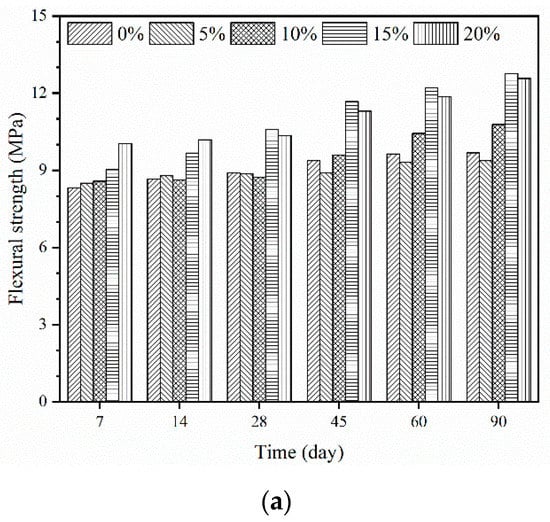 The flexural strength tests of mortar prism specimens were carried out using a universal test machine at the ages of 7 d, 14 d, 28 d, 45 d, 60 d, and 90 d, according to standard ISO 679:2009 [53]. The tests were conducted under a load control mode with a constant loading rate of 50 N/s. For each parameter, three specimens were loaded up to failure. The average flexural strength of mortar prism specimens can be calculated by Equation (2):