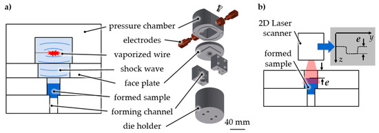 The general material characterization was performed as follows (Figure 1). A pulse generator was used with a maximum loading energy of EC = 1800 J, a capacity of C = 100 µF, and a maximum loading voltage of U0 = 6 kV. The discharge was initiated over a single ignitron (National Electronics NL508/NL508A, Richardson Electronics, LaFox, IL, USA) resulting in peak currents of Imax = 5–10 kA. The electrical discharge of the current pulse generator provided the energy for vaporization. An aluminum (Al99.5) wire with a length of lw = 20 mm and a diameter of dw = 0.3 mm was placed between two copper within a water-filled pressure chamber. The discharge led to the vaporization of the wire and plasma. Shock waves arose that caused a pressure increase—up to several GPa (gigapascals) were possible—within a few microseconds. The shock wave power is influenced by the loading energy of the pulse generator and the material as well as by the geometrical properties of the vaporized wire [12]. The shock wave acted as an adaptable stamp on the micro samples (Figure 1a). Depending on the applied load, the friction conditions between the sample and die, and the sample material’s behavior, the sample was pulse pushed into the forming element of the die. The progress was measured with a laser scanner as extrusion depth e (Figure 1b) or a comparable geometric value due to the testing case.