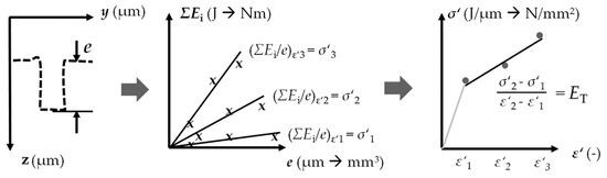 Consecutive vaporized wires incrementally transmitted energy to the micro sample in several small extrusion steps. The extrusion depth e, which is a measure of the forming result, is a function of the cumulated energy ΣEi, which is a measure of the cumulated forming effort. The supplied loading energy was transferred to forming energy. The plastic strain in the sample depends on the geometry of the forming element in the channel. The relative energy ΣEi/e was determined as the stress equivalent σ′ for different stress and related to different strain ε′. The resulting flow curves equivalent was considered equivalent to the flow curve (Figure 2). As a first approximation of the flow curve equivalent σ′(ε′), the tangent modulus ET can be considered part of the bilinear hardening.
