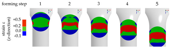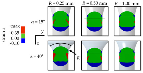 As confirmed by the simulations, a diameter reduction caused tensile strain during incremental extrusion (Figure 5). The channel was designed to maximize positive strain fields. An increase of strain was reached with a higher opening angle (α) and a lower radius (R). Smooth more monotone fields were realized by a decrease of angle and an increase of radius.