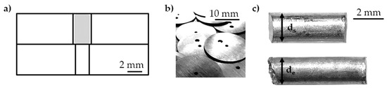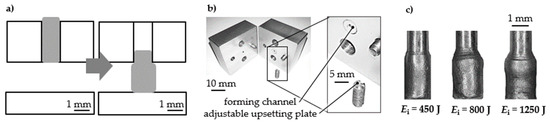 The material characterization by compression of micro samples was performed (Figure 9). Cylindrical Al99.5 samples had an initial diameter of ds = 1.00 mm. The initial channel diameter was di = 1.00 mm, and the gap distance was hg = 2.00 mm. Short-term compression was performed in one step with different energies Ei = 450 J, 800 J, and 1250 J. Micro samples were accelerated over the gap distance by adapting the shock wave and performing a partial free compression. The micro samples deformation increased with the supplied energy. The resulting deformation and decrease in cylindricity increased with energy Ei = 1250 J. The given free-forming behavior of the samples agrees with the observations by Sterionow [17] about the dynamic effects in free compression behavior of samples under increased forming speed due to the impact on the compression plate and high strain rates. Opening the die after forming and unloading the sample without sticking was possible.