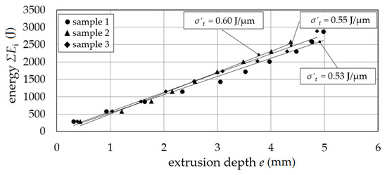 In the single stage diameter reduction, the energy ΣEi as a function of the extrusion depth e showed an average tensile stress equivalent to σ′t = 0.56 J/µm for different samples 1 to 3 (Figure 7) for constant tensile true strain equivalent ε′t calculated with extruded (de) and initial sample diameter (ds) ε′t = |2 ln(de/ds)| ≈ 0.22.