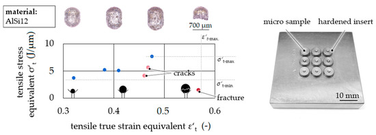 Testing was performed on cylindrical and spherical samples with an initial diameter of ds = 0.8–2.0 mm. With an energy increment of Ei = 200–800 J for each incremental extrusion step in the vaporization of aluminum wires, the final deformation was reached with ΣEi—depending on the test equivalent with several or at least one extrusion step. The edge radius R varied in different test set-ups. The configurations of different test equivalents under different stresses are found in Table 1.