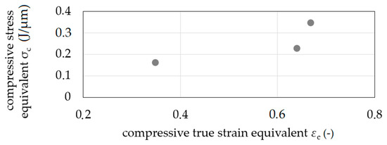 The increase of sample diameter was measured at five positions, and the mean value was calculated with Equation (1). The compressive stress equivalent σ′c was calculated for the performed compression with different compressive true strain equivalents ε′c calculated by ε′c = 2 ln(/ds) (Figure 10). The resulting curve is considered to be a compression flow curve equivalent.