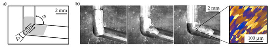 A short-term characterization by shear testing (torsion) was performed with four dies with different shear angles Φ of 90° to 135° based on the novel method equal channel angular blasting (ECAB), where shear stresses are induced—as established by equal channel angular extrusion (ECAE) [18] or equal channel angular pressing (ECAP) [19], respectively—by electrohydraulic extrusion (Figure 11). The shearing of cylindrical aluminum samples (Al99.5) with ds = 2 mm and length ls = 5 mm through the channel with a constant channel diameter de = 2 mm and dd = 2 mm by ECAB was possible in multiple extrusion steps (Figure 11b). Shear strain γ is calculated by [20] for ECAP, as given by Equation (2) with transition radius Ψ and shear angle Φ in degrees.