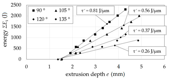 The shearing of grain was verified by the grinding pattern (Figure 11b). The opening between the extrusion steps was enabled. No material flow into the gap between the die sides with a radial gap was detected. Incremental energy ΣEi as a function of extrusion depth e showed a constant slope ΣEi/e depending on the shear angle Φ as can be seen in Figure 12. A decrease of shear angle resulted in an increase of slope, which corresponds to the change in the pressing force of conventional equal channel angular pressing at different shear angles.