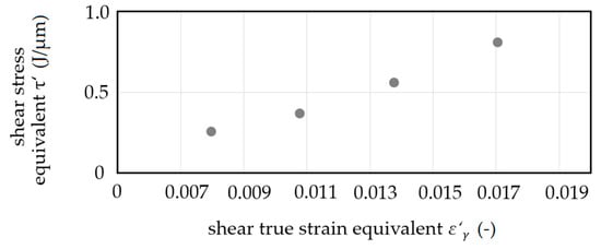 The shear true strain equivalent ε′γ is introduced as ε′γ = ln(γ + 1). Shear stress equivalent τ′ increased with the increase of shear true strain equivalent ε’γ (Figure 13). This increase corresponds to the idea of a flow curve equivalent in the sense of load dependent strain hardening. An increase of the resulting strain hardening with an increase in shear true strain equivalent was confirmed by quasi-static compression tests at an Hegewald and Peschke inspect table 100 testing machine (compression of ε = 1.0). With a maximum force of Fc ≈ 1.75 kN for compression in the radial direction on the unformed sample, the maximum force for compression of formed samples increased by 15% for samples sheared by ε′γ = 0.008 up to 23% for samples sheared by ε′γ = 0.017.