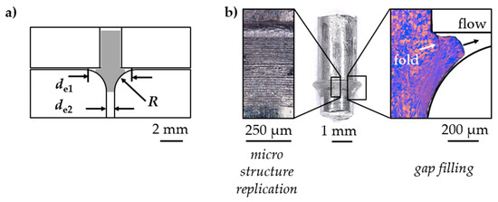 For material characterization related to the production of real parts, the forming channel was designed to emulate the multi-axial strain of a production process. Cylindrical aluminum samples (Al99.5) were tested by applying one, single incremental extrusion step with an incremental energy of Ei = 800 J. The initial channel diameter was di = 2.00 mm, sequentially increased to a maximum of de1 = 3.70 mm while being reduced afterwards to an extrusion channel diameter of de2 = 1.70 mm. Hence, the material was stressed by compression with a partial backflow resulting in shearing. A subsequence tensile stress was applied (Figure 14). By intensive forming in a diameter increase, high strain was reached in the sense of material-forming limit testing. Furthermore, in the sense of production-related material testing, form-filling properties by micro structure replication and gap filling were addressed (Figure 14b). As a result, the test introduces the potential of incremental electrohydraulic extrusion in micro channels for recreating and simulating the production of parts. The tested material withstood intense strain. Due to material flow and friction conditions, 70% gap filling was performed.