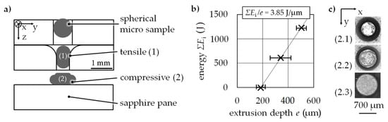 A cyclic load test equivalent was realized by sequenced tensile (1) and compressive (2) forming stages (Figure 15). The whole sample is first drawn and afterwards pressed. A further means of cyclic testing is the continuous increase of strain. A radial channel cut is used for the upsetting stage with a gap of hg = 1.00 mm. A sapphire pane was used here as a compression plate that gives optical access for measurement for later testing scenarios. Spherical 100Cr6 micro samples in an annealed state with an initial sample diameter of ds = 0.79 mm were successfully extruded through a micro channel with a diameter of de = 0.70 mm for tensile stress. The energy increased as a function of extrusion depth (Figure 15b).