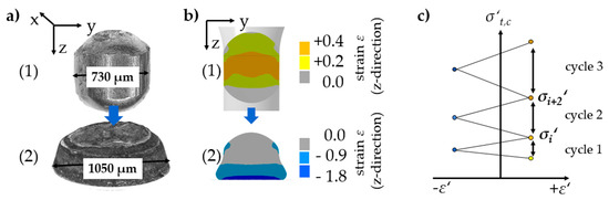 In the second stage, compressive stress was applied successfully on a micro sample by incrementally forming it on a sapphire pane. The forming of the 100Cr6 micro sample on the sapphire pane is shown in Figure 15c. For each incremental energy (Ei = 800 J) an increase in the sample’s diameter resulted in a contact zone between the sample and compression plate. Using simulations in Ansys, the resulting stresses and strains and the size of the strain fields can be conducted (Figure 16).