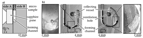 Due to the demand for measurability as well for channels with increased length, future work deals with the investigation of base geometries like winding channels (Figure 17a). Forming tests proved the suitability for forming into multi-stage channels with an aspect ratio >10 and a change in the forming direction. Material samples were analyzed by optical measurement through a sapphire pane, which is one side of a forming channel (Figure 17b). The measurement technique conducted through an inspection window during electrohydraulic incremental forming is well described by Stöbener et al. in [21]. The determined flow curves will be correlated to further material characterization results. Furthermore, forming channels are planned to be used for the measurement of friction conditions in forming processes.