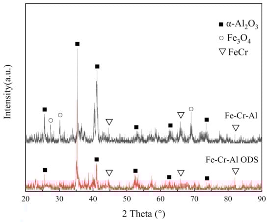 Figure 3 shows the surface X-ray diffraction patterns of the Fe-Cr-Al alloy and Fe-Cr-Al ODS alloy after high-temperature oxidation. The relative intensity of the α-Al2O3 diffraction peaks in the XRD of the two alloys is the highest, which indicates that the main components of the oxide layer after high-temperature oxidation were Al2O3. For the Fe-Cr-Al alloy, there was a small amount of Fe2O3 in the oxide layer. In addition, since XRD penetrates the oxide layer to the matrix, the peak of FeCr is displayed for the two alloys.