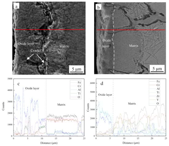 Figure 4a,b show cross-sections of the two alloys after oxidation treatments at 1200 °C for 100 h. The thickness of the oxide layer of the Fe-Cr-Al specimen was obviously thicker than that of the ODS specimen. The oxide layer thicknesses of the two alloys were about 13 and 6 μm, respectively. Cracks (marked by white arrows) were observed in the oxide layer of the Fe-Cr-Al specimen as shown in Figure 4a, which indicates that O can pass through these cracks resulting in accelerated oxidation t. Upon the addition of Y2O3 and Zr in the Fe-Cr-Al alloy, the oxide layer became thinner as shown in Figure 4b. The EDS-line scans shown in Figure 4c,d show that the main elements in the oxide layer were Al and O. This suggests the presence of alumina scale on each alloy. In addition, for the Fe-Cr-Al specimen, the matrix near the oxide layer had a lower Al content.