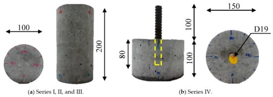 Figure 2 shows the geometries of the concrete cylinders with and without an embedded steel bar that were chosen in the presented study for the desired four series. Figure 2a shows the standard cylinder geometry that was casted for series I, II, and III, having a diameter of 100 mm and a height of 200 mm, while the casted specimen for series IV was a cylinder with a diameter of 150 mm and a height of 100 mm, as shown in Figure 2b. A steel deformed bar with a nominal diameter of 19.1 mm was embedded inside the concrete cylinder, which is one of the most used reinforcements in the construction field, with an 80 mm embedded length (around four times the bar nominal diameter). The material properties of the embedded steel bar are shown in Table 2. The short embedment length of the steel bar was designed to avoid the yielding under pullout loading. The geometry of the tested specimen for series IV was designed to be fit inside the chamber of the testing apparatus.
