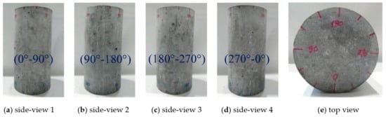 All tested specimens were cured through submerging using shallow containers satisfying the full saturation condition for the desired period before testing. After curing, the surfaces of each specimen were dried to allow markings to be applied around the circumference, dividing the cylinder into four view locations. Figure 3 shows the marked top of a specimen and the four side views: 0–90°, 90–180°, 180–270°, and 270–0°. These markings allowed for the monitoring of the damage level and damage evolution in terms of crack location and width during and after testing. Each specimen (except PC and RC, which were not tested under high water pressure) was placed in the pressure chamber with the 0° marking near or parallel to the hose inlet.