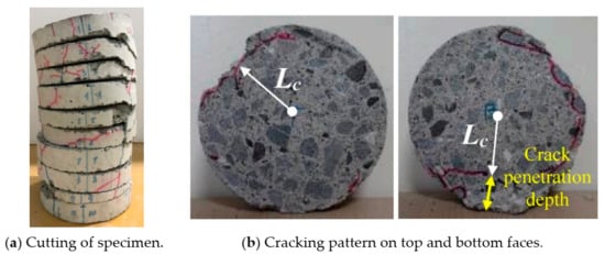 On the other hand, specimens in the third series were cut using a metal cutting saw. The cutting speed of the blade was less than 0.5 mm/s, slow enough to avoid the additional cracking. They were cut into ten slices by height after testing, in order to observe internal cracking for comparison with surface cracks, as shown in Figure 4a. Images of the internal cracking pattern for each slice on both the top and bottom faces were monitored, as shown in Figure 4b, with indications to illustrate the method of recording the maximum crack penetration depth. As can be seen, some chipping of the concrete occurred during the cutting process. Therefore, to obtain the crack penetration depth, the distance (LC) between the slice center and the point of deepest crack penetration was measured (see Figure 4b); then, the crack penetration depth was obtained using Equation (1). Finally, the surface and internal cracking conditions are compared for the two specimens (III-PC-60R and III-PC-150R) to gain an understanding of the fracture mechanism of concrete after repeated high water pressure.