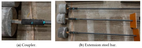 For the fourth series of specimens, which were the concrete cylinders with an embedded steel bar, pullout tests were implemented to estimate the residual pullout capacity and evaluate the degree of bond damage at the matrix/steel bar interface. To carry out the pullout test, a long steel extension bar with a nominal diameter of 19.1 mm and a length of 110 cm was securely connected to the embedded bar using a coupler, as shown in Figure 5. This gave the loading jack sufficient purchase on the steel bar to apply tensile force for the pullout, as could be seen in Figure 6.