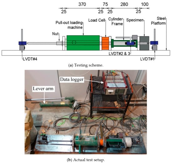 Figure 6 shows the pullout test setup, which follows the same procedure as used in Punyawut et al. [], wherein the applied tensile load and the associated displacement are measured using a load cell and linear variable differential transformers (LVDTs) (Tokyo Measuring Instruments Lab., Tokyo, Japan), respectively. The relative displacement of the steel bar from the concrete is calculated from the average displacement obtained from two LVDTs, LVDT#2 and LVDT#3. Besides, any movement of the concrete specimen and the extension steel bar was monitored by fitting them with LVDT#1 and LVDT#4. Pullout capacity was measured using Equation (2).