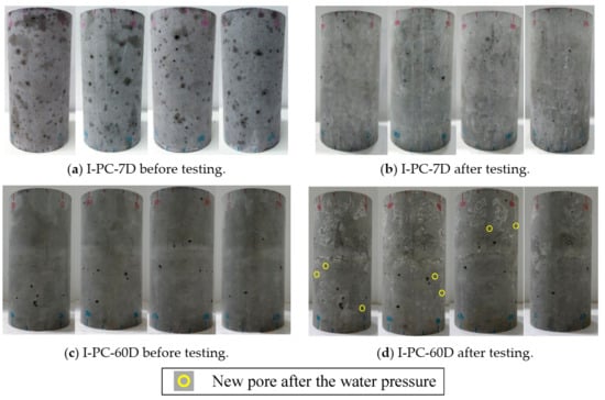 Figure 7 shows the surface cracking for the four side views of specimens I-PC-7D (7 days under pressure) and I-PC-60D (60 days under pressure) obtained before and after sustained high-water-pressure testing at 60 MPa. In the case of I-PC-7D, there is no change in pores, cracks, or damage after 7 days of high water pressure as compared with that before testing, as shown in Figure 7a,b. On the other hand, specimen I-PC-60D after 60 days of high water pressure has small pores on the surface but no cracking. These pores are marked using yellow rings in Figure 7c,d. These seven marked pores may have occurred because of the washing out at weaker points of the concrete surface because the specimen was maintained in a fully saturated condition.