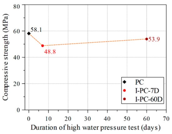 After these concrete cylinders had been tested under sustained high water pressure of 60 MPa (which is about the same as their initial uniaxial compressive strength), a uniaxial compression test was conducted to estimate the residual compressive strength. Figure 8 shows the results for the two specimens as compared with the control specimen (PC). An instant reduction in compressive strength by around 16% occurred after 7 days under pressure. However, after 60 days of sustained high water pressure, the compressive strength had stabilized and recovered slightly compared with the value at 7 days. The marked reduction in strength early in the application of sustained high water pressure highlights the role of water flow driven by the differential between internal and external water pressure. The differential leads to active changes in pore water pressure that cause local stresses, and these eventually result in the loss of concrete strength, as previously reported by Clayton [].