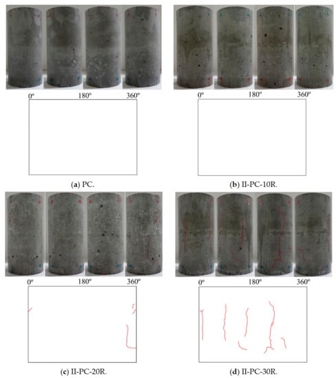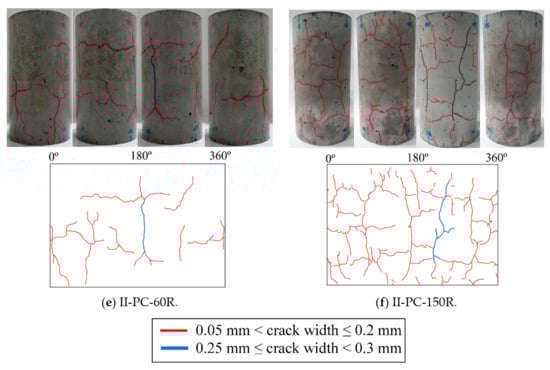 Figure 9 shows the surface cracking of tested specimens after the repeated application of high water pressure for 10, 20, 30, 60, and 150 cycles. Cracks ranging in width between 0.05 and 0.20 mm are colored red, with blue used for crack widths ranging between 0.25 and 0.30 mm. It can be seen in this figure that, for specimen II-PC-150R, cycles of loading and unloading resulted in gradually propagating cracks on the surface up to 150 cycles. After the initiation of the cracks, they gradually joined together in the lateral and longitudinal direction, resulting in more severe damage as the number of cycles increased.