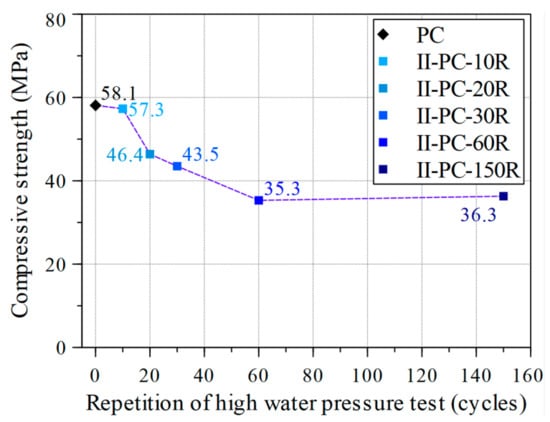 Compressive strength versus the number of repeated cycles of high water pressure.