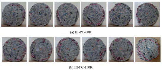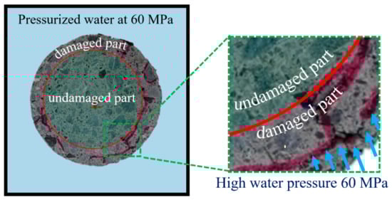 Figure 13 illustrates the penetration of pressurized water at 60 MPa into the concrete cylinder after a certain number of loading–unloading cycles between 60 and 150 cycles. An undamaged core of concrete remains without any cracks, while cracks propagate around the damaged zone as cracks within this weaker zone join together. There is a clear tendency for cracks to form and develop within the already damaged outer region than to penetrate deeper inside the undamaged zone.