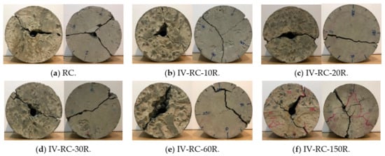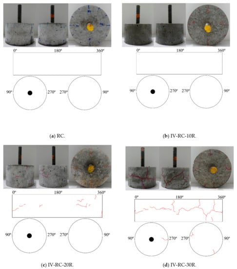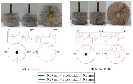 Figure 14 shows the surface cracking of cylinder specimens with an embedded steel bar after the application of repeated cycles of high water pressure at 60 MPa maximum pressure. After 10, 20, 30, 60, and 150 cycles, the surface cracking is markedly similar to that in the second series. In this figure, the cracks are similarly colored red for widths between 0.05 and 0.20 mm, and blue for widths between 0.25 and 0.30 mm. Surface cracking becomes visible after 20 loading–unloading cycles (specimen IV-RC-20R) and cracks gradually become larger and longer in both radial and longitudinal directions up to 150 cycles. Seen from the top face of the specimen (where the steel bar protrudes), the propagation of cracks in the depth direction advances until they almost reach the embedded steel bar in specimen IV-RC-150R, as shown in Figure 14f.