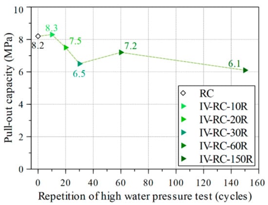 After subjecting these concrete cylinder specimens to cyclic high water pressure, pullout tests were conducted to evaluate the residual pullout capacity, as explained in Section 2.5. Figure 15 shows the results for specimens IV-RC-10R, IV-RC-20R, IV-RC-30R, IV-RC-60R, and IV-RC-150R as compared with the control specimen (RC). After 10 loading–unloading cycles (specimen IV-RC-10R) and with no surface cracks observed (see Figure 14b), the residual pullout capacity was unchanged. Thereafter, residual pullout capacity gradually fell by 26% to 6.5 MPa from 10 to 30 cycles, as shown in Figure 14c,d. This corresponds with the propagation of surface cracks on the specimens. In specimens subjected to 60 and 150 cycles (IV-RC-60R and IV-RC-150R), the residual pullout capacity did not fall further but stabilized somewhat (see Figure 15), corresponding to the stabilization of compressive strength in the second series.