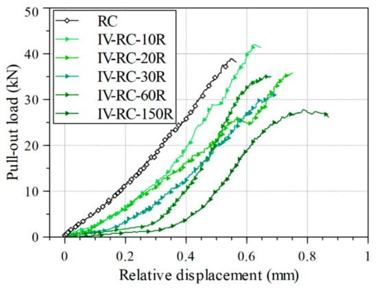 Figure 16 shows the relationship between pullout load and relative displacement for the fourth series during the pullout tests. The results showed a degradation process in the stiffness, defined as the initial elastic slope of the load–displacement relationship in Figure 16, between 10 to 150 loading–unloading cycles of high water pressure. Further, there is an initial increase in relative displacement as loading starts, and the displacement increment is greater with more cycles. This might indicate slippage of the steel bar reflecting the loss of bond strength at the matrix/steel bar interface after repeated exposure to high water pressure.