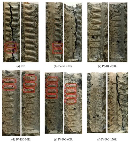 Figure 18 shows the interface for each of these specimens, showing damage to the concrete ribs (an indicator of bond strength). Damage accrued gradually from 10 to 150 loading–unloading cycles, with the concrete finally becoming smooth and fully crushed in specimen IV-RC-150R after 150 cycles, as shown in Figure 18f. The repeated application of the high water pressure would have resulted in significant pore water pressure stresses, and these were particularly severe toward the top of the specimen near the steel bar. The result was incremental damage to the concrete ribs as the number of cycles increased. However, concrete being heterogeneous, the internal damage at the interface is not equally distributed; the red markings in Figure 18 indicate some ribs that are partially crushed but with some stronger parts intact. That could be the cause of the little increase in the residual pullout capacity for specimens IV-RC-10R and IV-RC-60R, as shown in Figure 15.