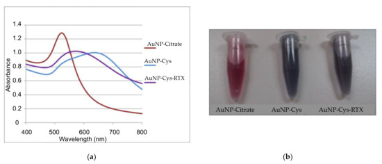 Figure 1 shows the different UV-vis spectra corresponding to the variation of the plasmonic band of the AuNPs corresponding to the three different stages leading to the preparation of the AuNP-Cys-RTX. After the preparation of AuNPs by reduction of HAuCl4 with sodium citrate, the plasmonic band (gold plasmon resonance) presents an absorbance maximum centered at 512 nm [31]. This band undergoes a broadening and bathochromic shift at 640 nm due to the exchange and functionalization of the AuNP surface with cysteine. This is due to the formation of new Au-S bonds between the Au of the nanoparticle and the thiol group of the cysteine. The AuNP-Cys formation creates a framework that will serve for the final amidation between a carboxylate group of the glutamine residue of RTX with the amino group of cysteine. This new functionalization causes a hypsochromic shift of the plasmon band at 520 nm. These three stages lead to different colors: AuNP-citrate red-wine (ruby-red); AuNP-Cys (blue), and AuNP-Cys-RTX (brown) due to electronic and colloidal changes in solution.