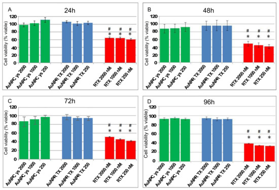 Behavior of the HCT116 cells after treatment with AuNP-Cys (green bar), AuNP-Cys-RTX (blue bar), and RTX (red bar) at different concentrations and time periods (A) 24 h, (B) 48 h, (C) 72 h, (D) 96 h. The nanoparticle (NP) concentrations are expressed as nM of RTX. Each bar represents the mean +/− SEM of three independent experiments performed in triplicate and normalized to non-treated cells (taken as 100%). The asterisk (*) and the hash mark (#) indicate significant differences between the viability resulting from treatment with “free” RTX and the equivalent concentrations of AuNP-Cys and AuNP-Cys-RTX, respectively (p-Value < 0.001).