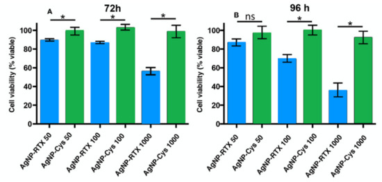 Behavior of the A549 cells after treatment with AgNP-Cys (green bar) and AgNP-Cys-RTX (blue bar) at different time periods (A) 72h (B) 96h and concentrations. The NP concentrations are expressed as nM of RTX. Each bar represents the mean +/− SEM of three independent experiments performed in triplicate normalized to non-treated cells (taken as 100%). Differences were analyzed preforming an ANOVA followed by a Newman–Keuls multiple comparison test. * p-value < 0.05; ns—no significant.