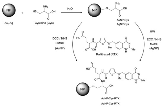 The synthesis of AuNP-Cys-RTX and AgNP-Cys-RTX have been done according to the sequence presented in Scheme 1.
