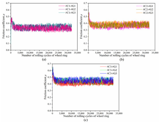- The variations of friction coefficients are classified into break-in phase and steady-wear phase. The wheel rings and rail blocks machined with various parameters engender different friction coefficients after pairing with each other, and the wheel rings with larger initial surface roughness give rise to larger friction coefficients. At the stable wear phase, the friction coefficients among different tribological pairs range from 0.32 ± 0.06 to 0.45 ± 0.06.