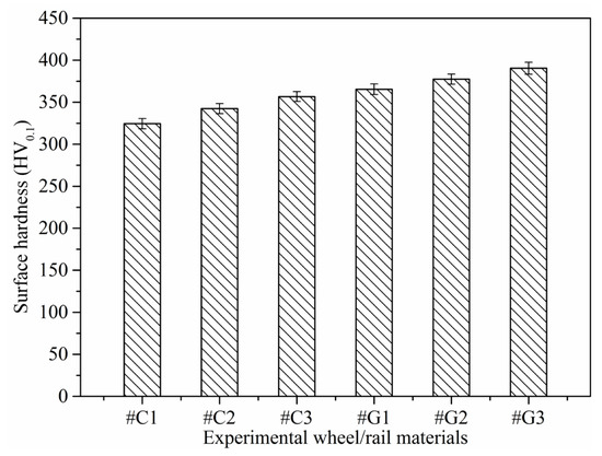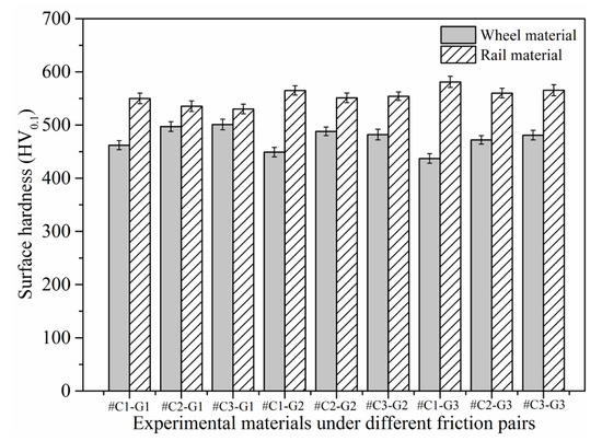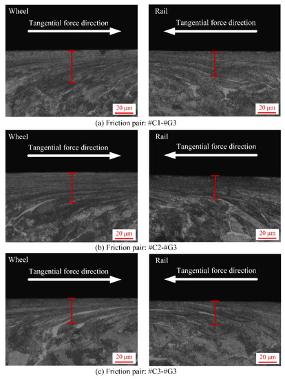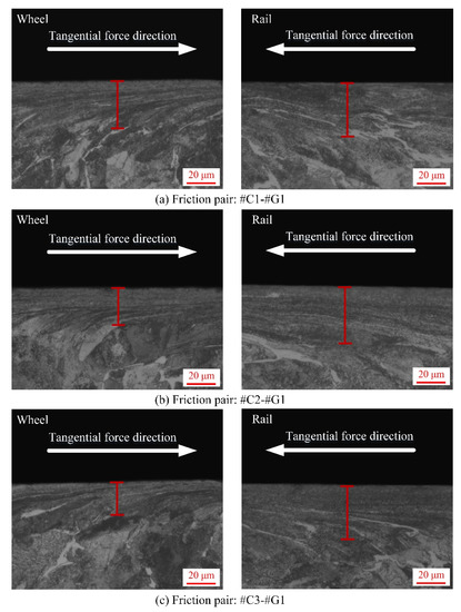 - Before the sliding test, the surface microhardness of the ground rail blocks is larger than that of wheel rings, while the thickness of the SPDL and surface roughness of the rail blocks are much smaller than those of wheel rings. After the sliding test, the surface microhardness of the wheel rings and rail blocks increases strikingly. The maximal surface microhardness increment of the wheel rings is 45.2%, while the maximal surface microhardness increment of the rail blocks is 50.8%. The thickness of the SPDL of wheel rings after sliding falls in between 28 and 37 µm, while the thickness of the SPDL of rail blocks falls in between 21 and 42 µm. The thickness increase degree of the SPDL of rail blocks is larger than that of the wheel rings.