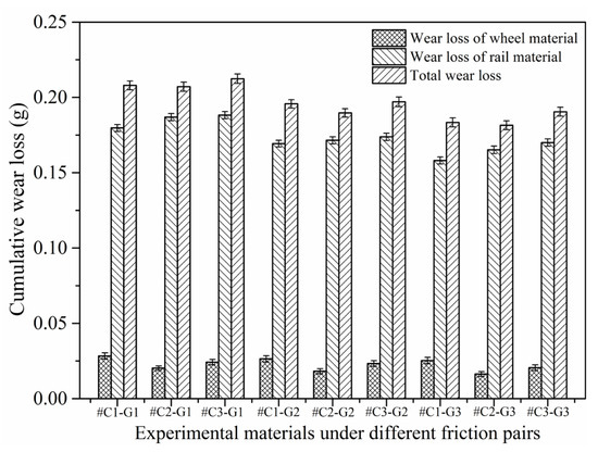 - After every sliding experiment, the wear loss of the rail material is more than 0.1581 g, while the wear loss of the wheel material falls in between 0.0163 and 0.0283 g. The wear loss of rail material is much larger, which means that the wheel material exhibits more excellent wear-resistance property. The surface microhardness, roughness and SPD of the machined wheel/rail samples impose a combined influence on the tribological behavior. The tribological pair with proper initial surface roughness and microhardness can engender the smallest amount of total wear loss. In terms of the total wear loss of wheel/rail materials among all the tribological pairs, the comprehensively preferable wear-resistance performance is achieved as #C2 pairs with the rail blocks.