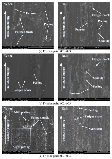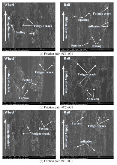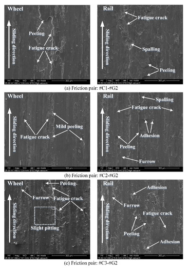 - The surface damage morphologies between the rail blocks and wheel rings after sliding are different. By and large, more serious surface damage of the rail blocks is observed. The worn surface morphology of the wheel rings primarily presents peeling, adhesive wear and fatigue cracks, while the worn surface morphology exhibits the combination of spalling, furrow wear, peeling, fatigue cracks and various degrees of adhesion.