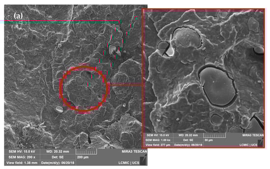In general, the lignosulfonate particles are spherical and randomly dispersed in PP without the formation of particle agglomerates. As can be seen in detail in Figure 1, there is a low interfacial adhesion between the PP and LGNa particles. This behavior can be explained by the incompatibility between the hydrophobic PP and higher hydrophilic characteristics of lignosulfonate probably due to the oxygen groups presented on the surface of LGNa. Lignosulfonates are compounds with hydrophobic phenylpropane units and strong hydrophilic sulfonic groups present on the surface of the particles [13,18]. Therefore, the weak interactions between the hydrophobic PP and the polar groups of the LGNa result in the formation of a heterogeneous blend with large dispersed LGNa particles. Cazacu et al. [19] also observed phase separation and an increase in the dimensions of separated domains with increases in the ammonium lignosulfonate content on the ethylene-propylene copolymer blend [19].